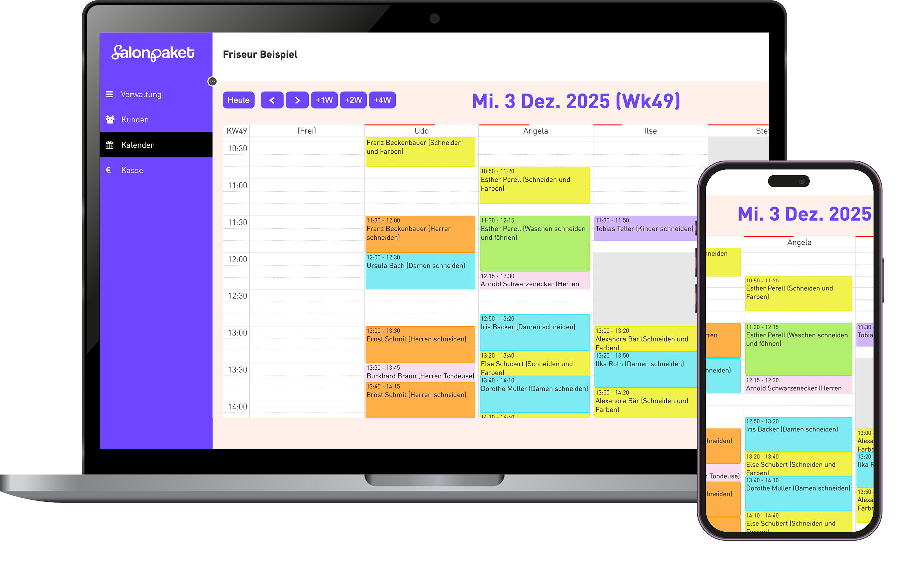 • Der SalonPaket-Kalender zeigt dir auf einen Blick deinen anstehenden Tag und deine Woche. Termine lassen sich einfach planen und verschieben und deine Kund:innen buchen rund um die Uhr flexibel online, wann es ihnen passt.